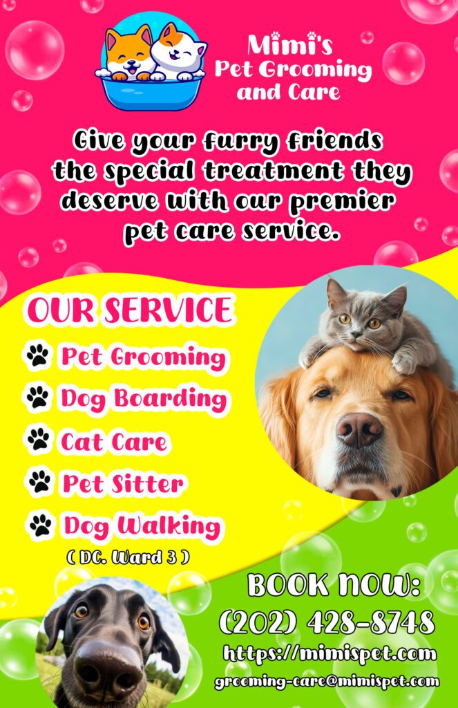 Mimi’s Pet Grooming proudly serves DC and surrounding areas. We work with pets of all shapes, sizes, and breeds, offering a variety of services that are sure to delight both you and your furry family members.